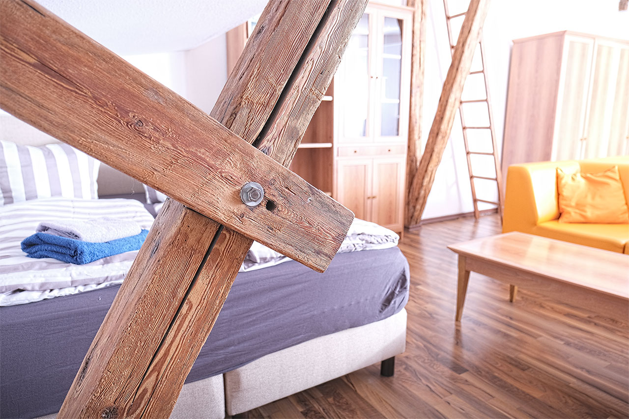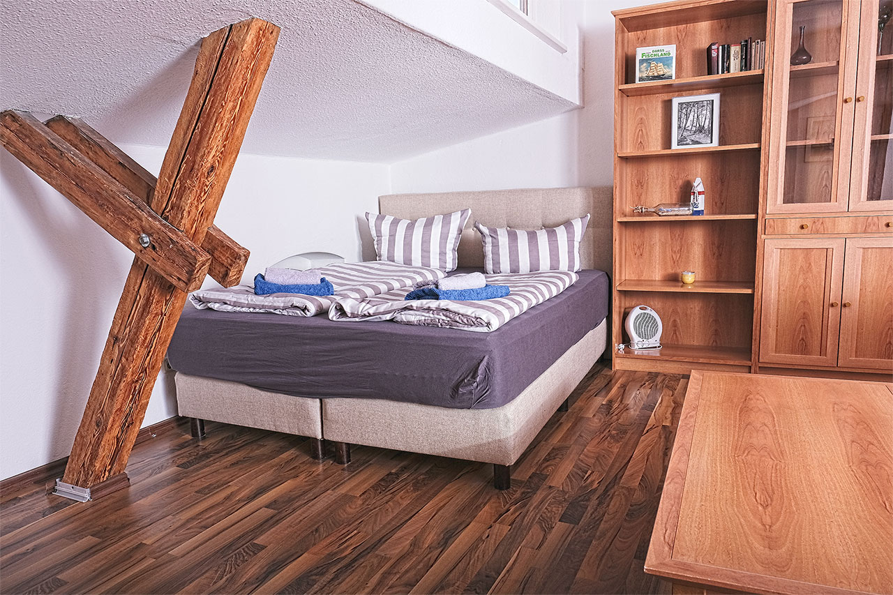 Für erholsamen Schlaf stehen Boxspringbetten im idyllischen Gebälk des großen Lofts bereit. Unseren kleinen Gäste bietet eine Schlafcouch ausreichend Raum für schöne Träume.